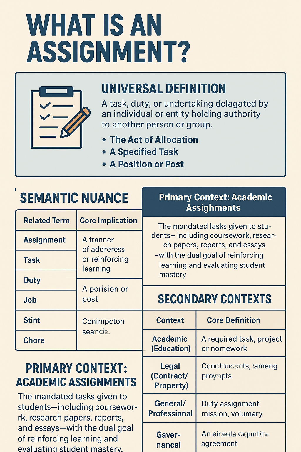 An assignment is fundamentally a task, duty, or undertaking delegated by an authority figure. While it most commonly refers to mandated academic work (such as homework, reports, or essays), its meaning extends to two other critical contexts: a specific post or role (duty assignment) and, in law, the formal transfer of rights, property, or claims from an assignor to an assignee.